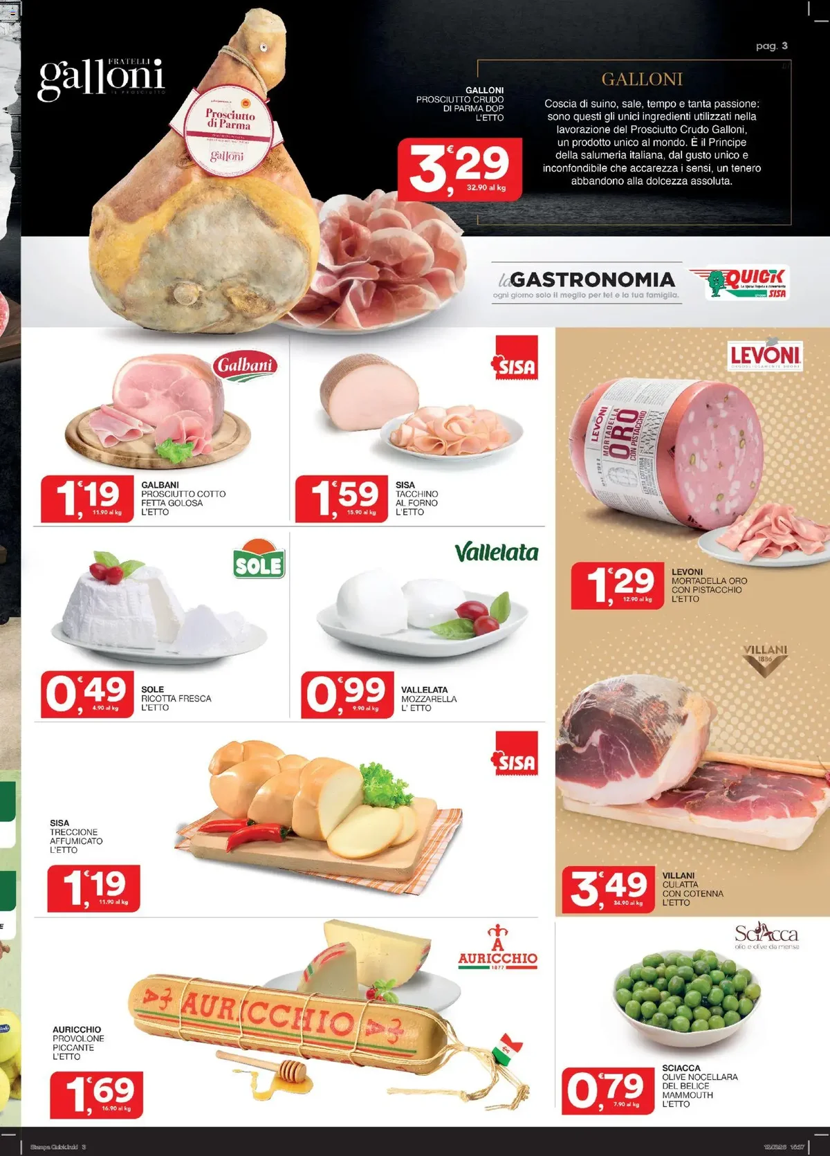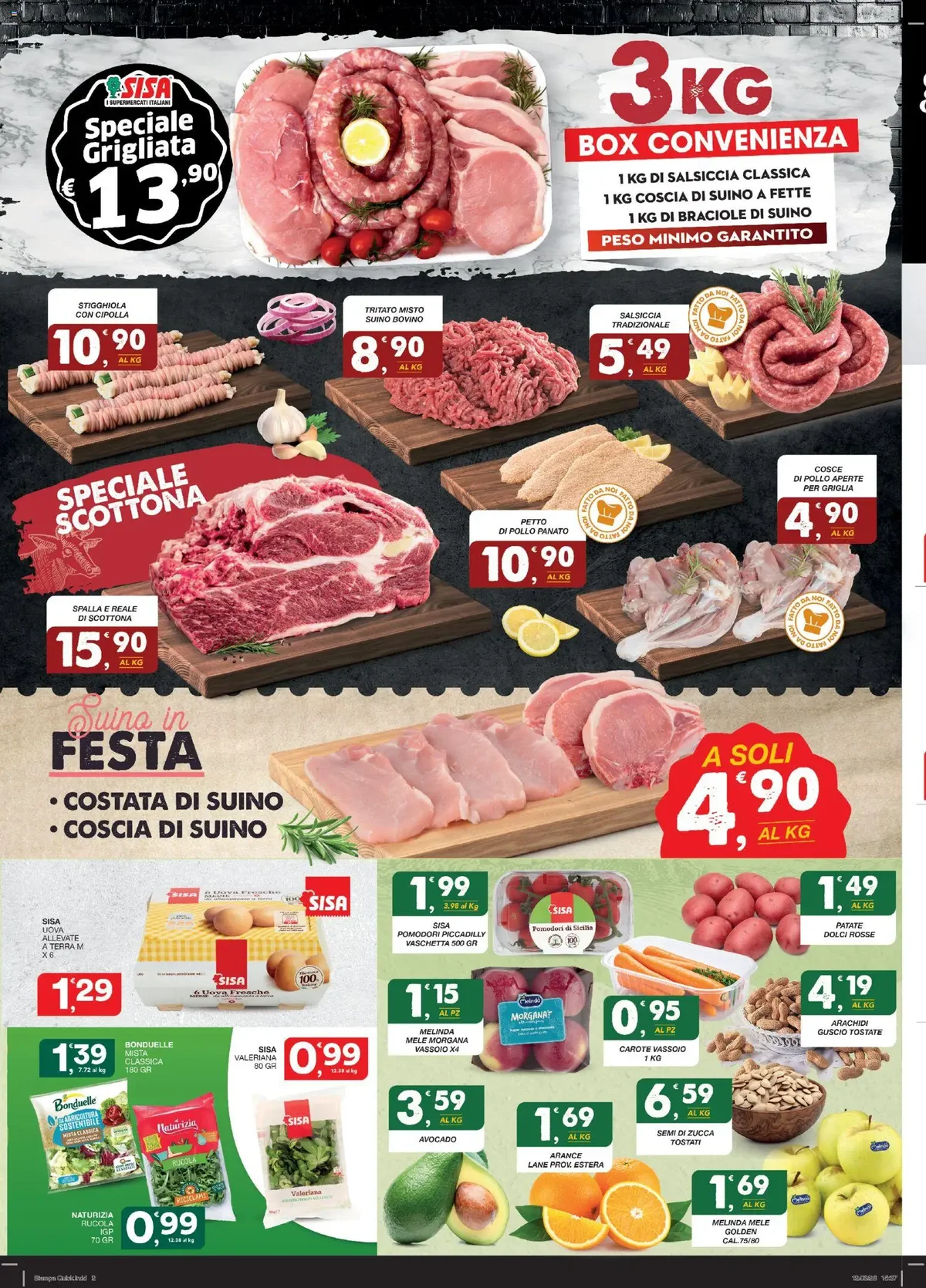 Per chi ama la carne, l'offerta SPECIALE GRIGLIATA Box Convenienza 3kg (Salsiccia, Coscia Suino, Braciole) a €13,90 è l'ideale per le prime giornate all'aperto. Non dimenticare il Tritato Misto Suino Bovino a €8,90 e le Costate o Cosce di Suino a €4,90. Anche il reparto freschi offre convenienza con i SISA Pomodori Piccadilly Vaschetta 500 gr a €1,99 e le Carote Vassoio 1 kg a €0,95. Per i salumi, il GALLONI Prosciutto Crudo di Parma DOP a €3,29 l'etto e la LEVONI Mortadella Oro con Pistacchio a €1,29 l'etto completano l'offerta.