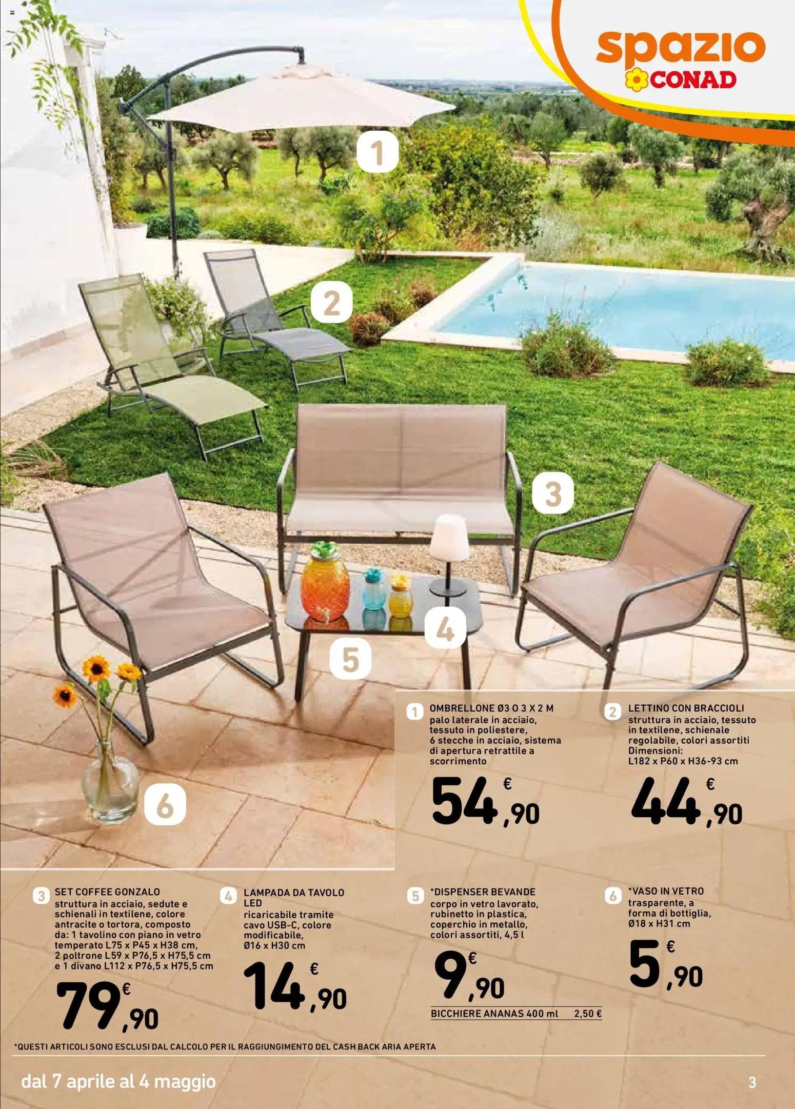 Approfitta di questa doppia convenienza per acquistare tutto ciò che desideri. Oltre ai set completi, il volantino Spazio Conad dal 7 aprile al 4 maggio 2026 propone anche soluzioni più economiche come il lettino con braccioli a 44,90 € o l’ombrellone da 3×2 metri a soli 54,90 €. Sfoglia il catalogo e scopri come rendere unica la tua estate, combinando stile, comfort e un risparmio eccezionale grazie all’iniziativa cashback.