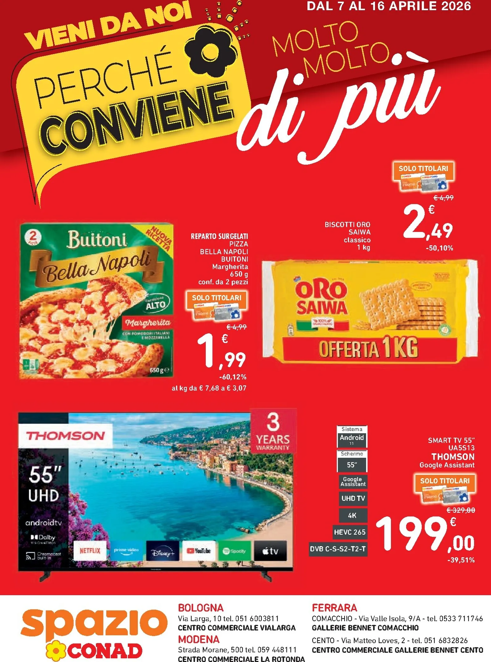 Il nuovo volantino Spazio Conad, valido dal 7 al 16 aprile 2026, lancia una settimana di risparmio con il motto “Perché conviene di più”. Le occasioni sono uniche, come la pizza Buitoni Bella Napoli a soli 1,99€ (-60%) e i biscotti Oro Saiwa da 1 kg a 2,49€ (-50%). Queste offerte della settimana rendono la spesa più leggera e, grazie a Spazio Conad Volantino dal 07/04/2026, potrete approfittare di queste e altre occasioni.