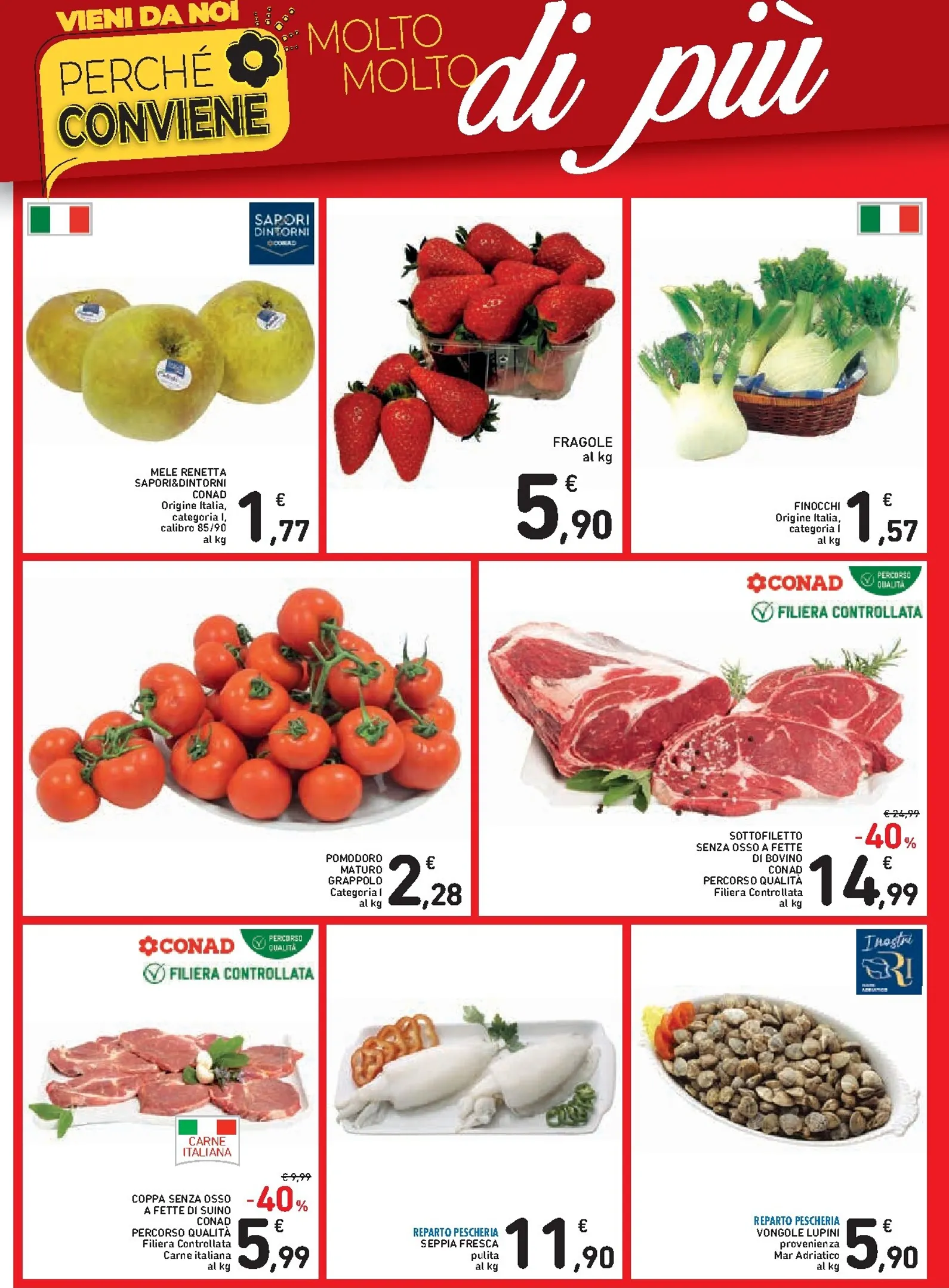 La convenienza prosegue nel reparto freschi con prodotti di stagione. Troviamo le mele Renetta a 1,77€/kg, le fragole a 5,90€/kg e i finocchi a 1,57€/kg. Le offerte della macelleria includono la coppa di suino a 5,99€/kg con uno sconto del 40% e il sottopaletta di bovino a 14,99€/kg. Anche la pescheria propone ottimi prezzi, con la seppia fresca a 11,90€/kg.