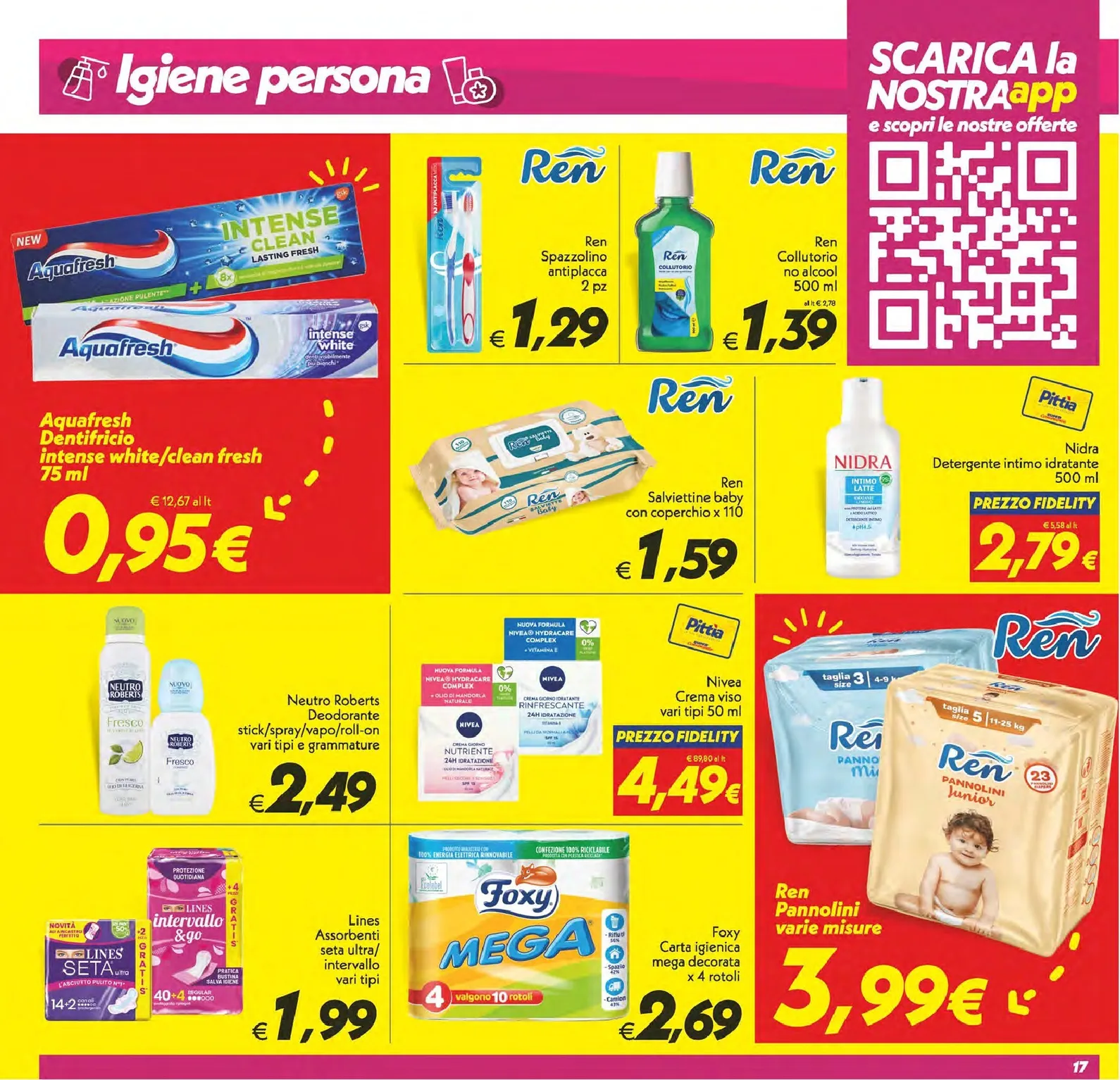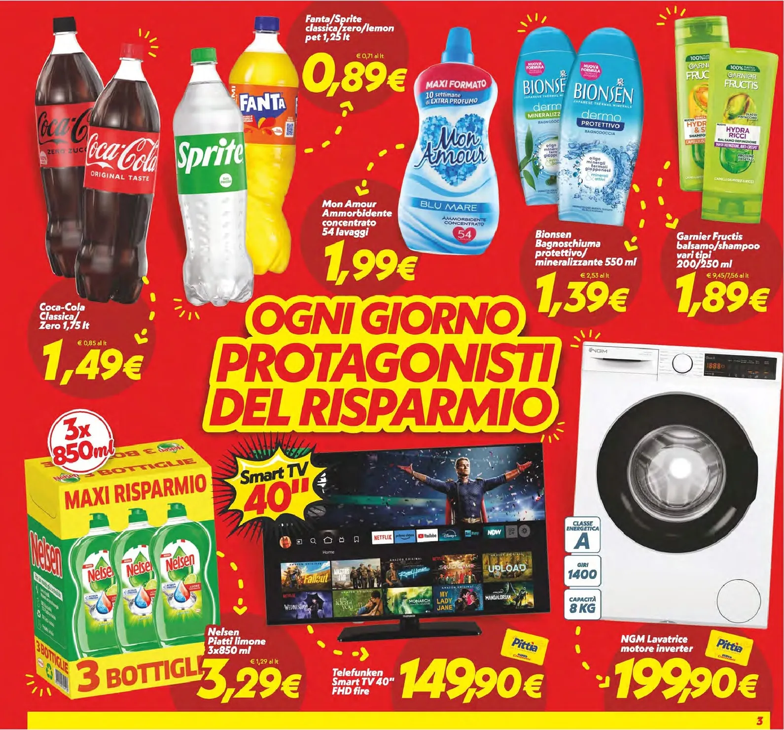 SuperConveniente pensa a ogni aspetto della vita quotidiana. Rinfrescatevi con Coca-Cola, Fanta o Sprite a prezzi vantaggiosi e prendetevi cura di voi con il bagnoschiuma Bionsen a 1,39€ o lo shampoo Garnier Fructis a 1,89€. Anche la casa brilla con il detersivo per piatti Nelsen nel maxi risparmio da 3 bottiglie a 3,29€. Ma le sorprese non finiscono: questo volantino è valido anche su incredibili offerte tecnologiche, come la Smart TV da 40 pollici a 149,90€ e la lavatrice NGM a 199,90€. Un’opportunità unica per rinnovare la casa e il proprio benessere senza pesare sul budget familiare, grazie a sconti eccezionali.