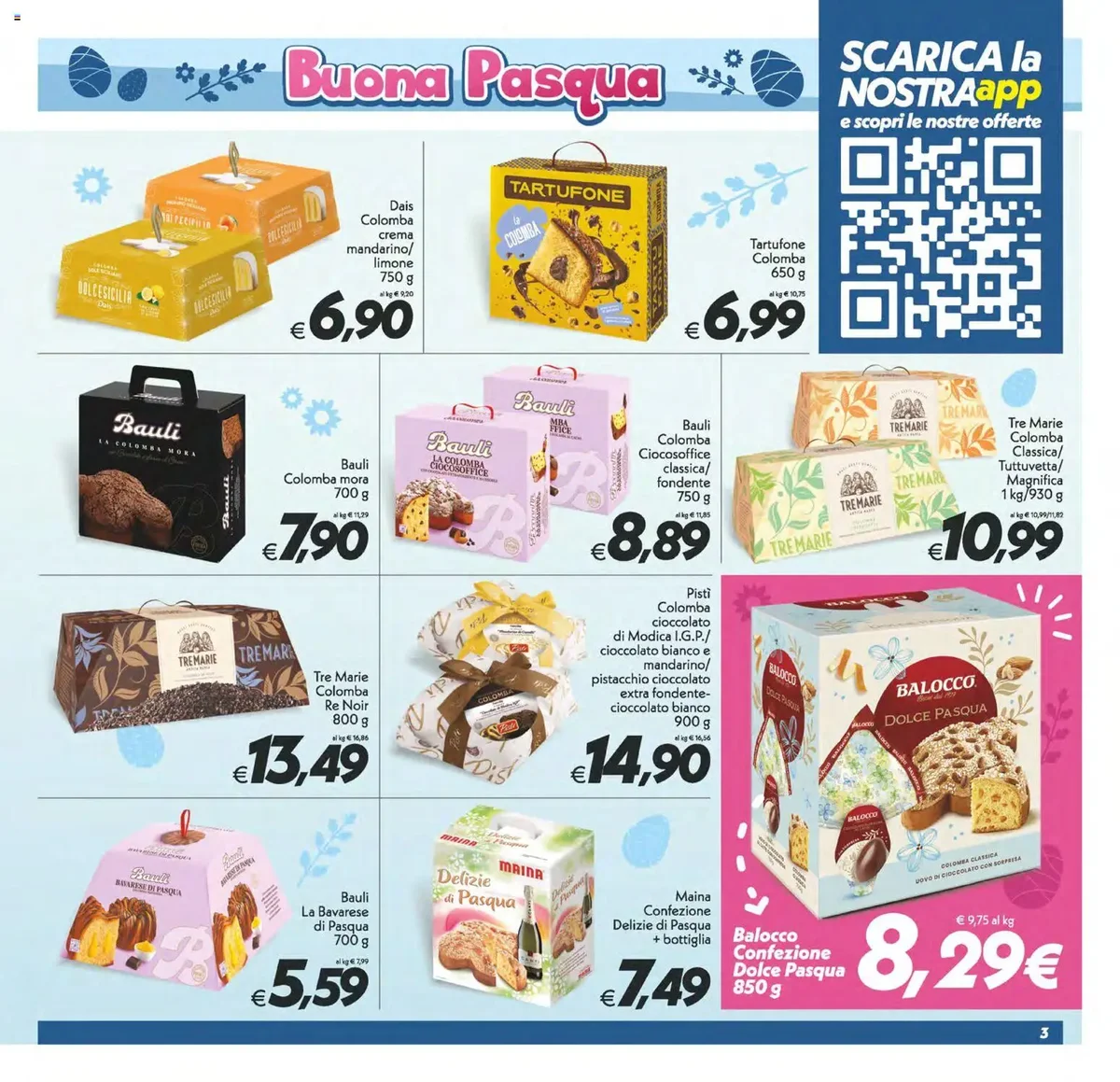 Tra le proposte più allettanti, spiccano le immancabili colombe pasquali, disponibili in una vasta gamma per tutti i gusti. Potrai scegliere la Bistefani Colomba classica da 700 g a soli 3,49€ o la Balocco Colomba Cuore d'Oro a 3,99€. Per chi ama le tradizioni, la Melegatti Colomba tradizionale da 1 kg è offerta a 5,99€, mentre per un tocco più raffinato, la Paluan Colomba crema chantilly da 750 g è a 5,79€. Non mancano le uova di Pasqua e gli ovetti: il delizioso Bay Uovo latte con anacardi – mandorle caramellate (o fondente) da 250 g è a 4,99€, e gli Zaini Ovetti vari tipi sono a 2,29€.