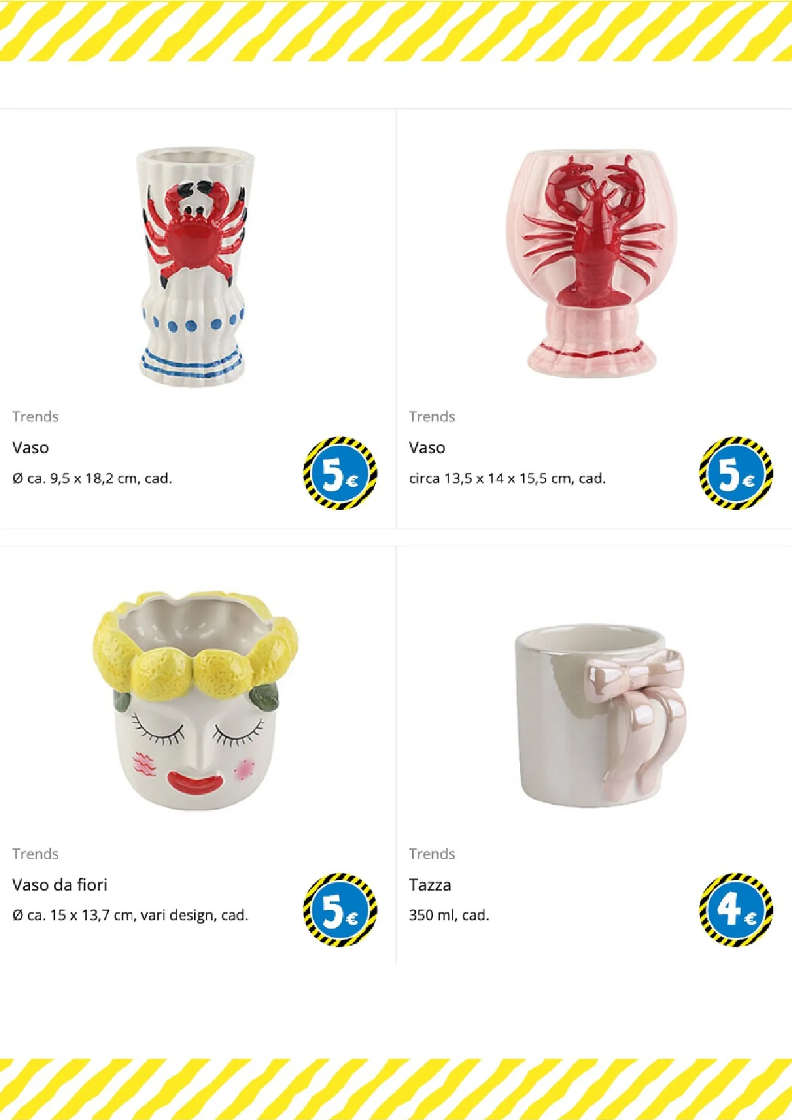 L’esplorazione continua con oggetti eccentrici e affascinanti. Il catalogo presenta due vasi a tema marino con aragoste rosse a soli 5€, ideali per arredamenti estivi. Per gli amanti del verde, il vaso da fiori a forma di viso con capelli di limoni aggiunge allegria. Non mancano le offerte per la colazione, come la deliziosa tazza rosa con fiocco in rilievo, disponibile a 4€, che unisce funzionalità e design.
