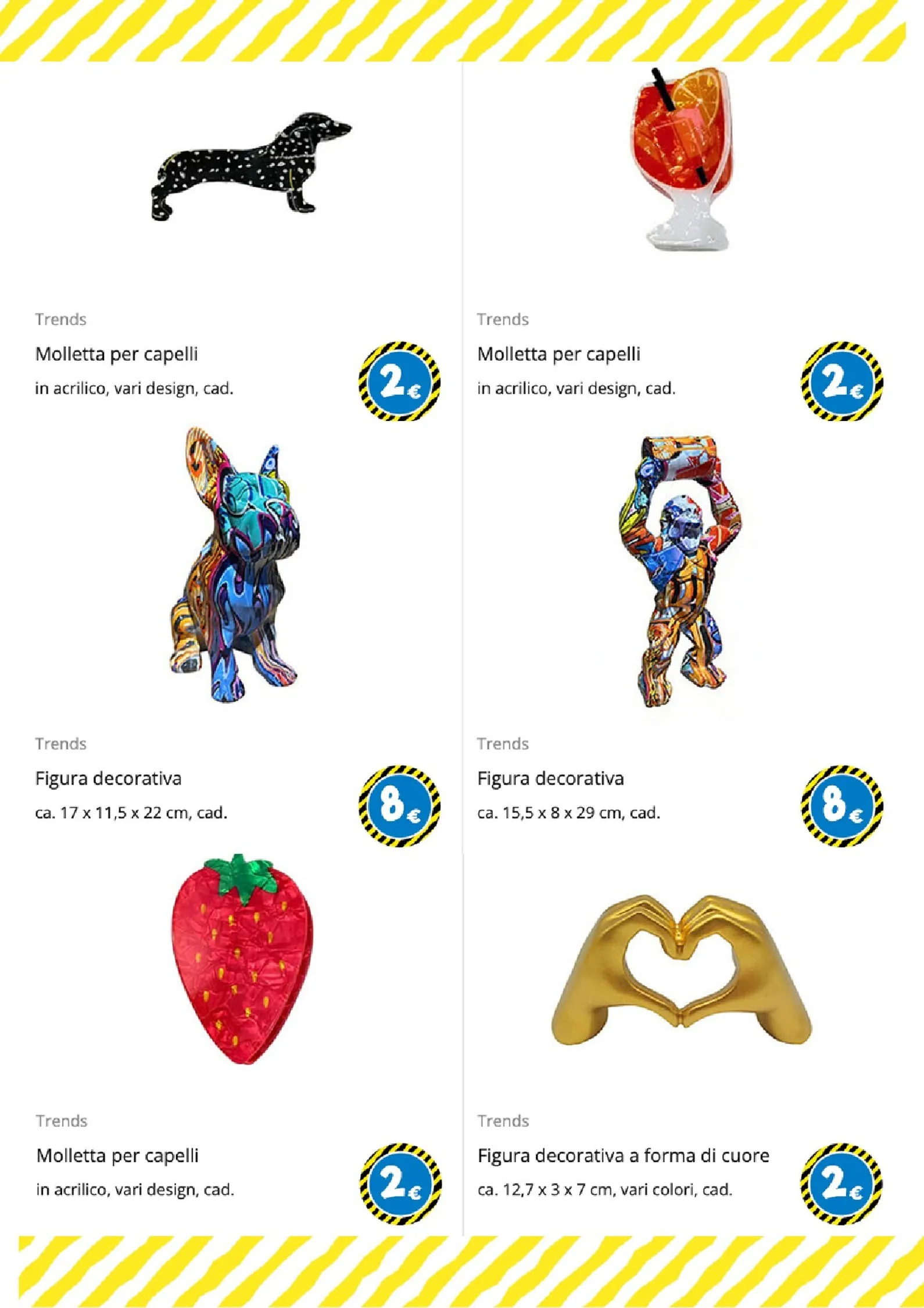 La creatività si estende agli accessori e alle figure decorative. A soli 2€, trovate mollette per capelli in acrilico a forma di bassotto o fragola. Per un impatto visivo maggiore, le figure decorative colorate, come il bulldog francese, sono disponibili a 8€. Per scoprire tutte le catalogo e offerte, consulta il nostro TEDi Volantino dal 09/04/2026 e visita il TEDi Volantino per vedere tutte le novità del marchio.