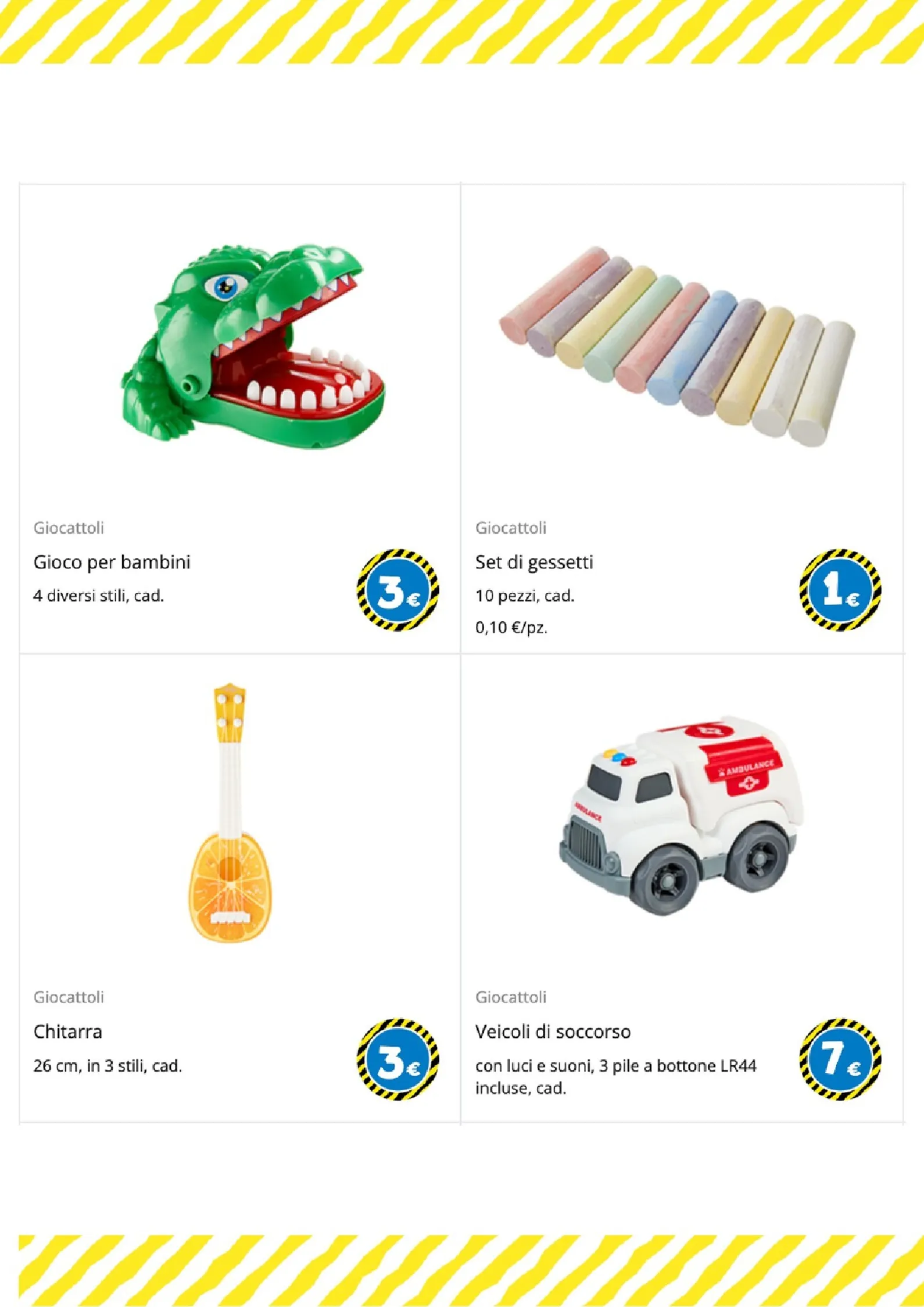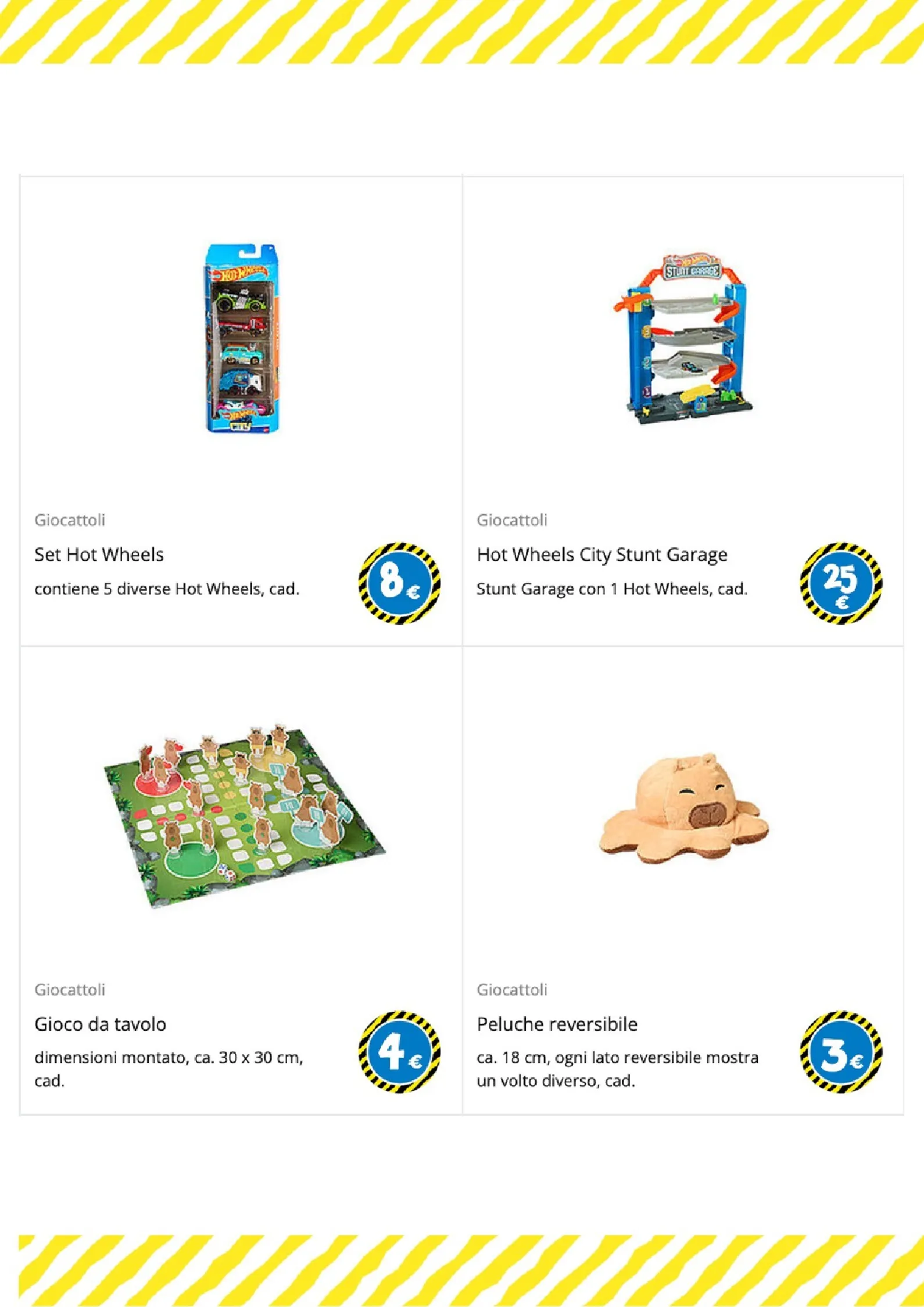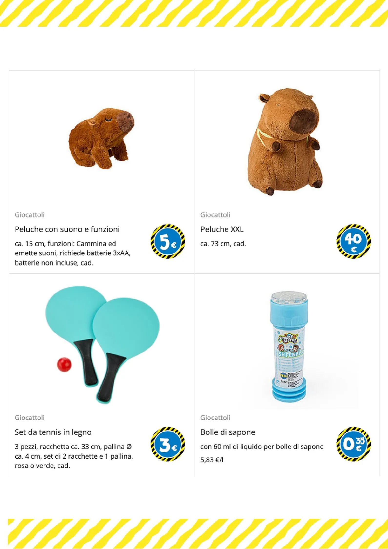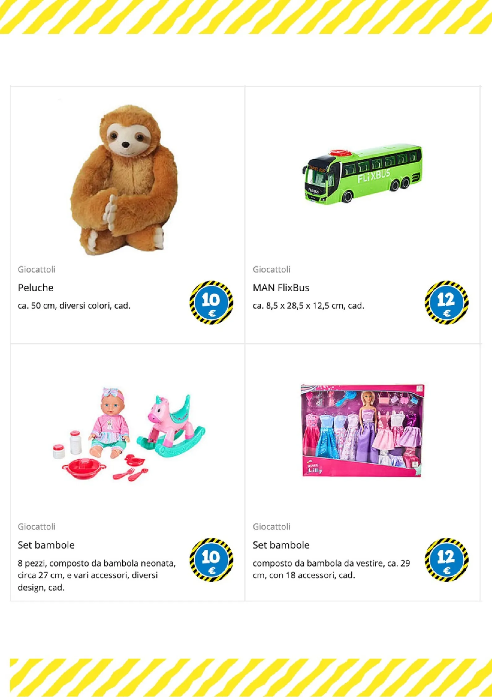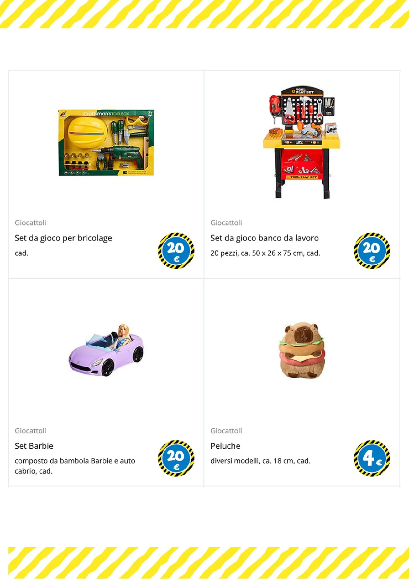 Per i più piccoli e gli amanti del gioco di ruolo, le opzioni sono numerose. Un morbido peluche a forma di coniglio è disponibile a 25€, mentre per le bambole ci sono il passeggino a 6€ e il biberon a 1€. La creatività è stimolata dai set di mattoncini a partire da 1€ e dal divertente set burger food truck, completo di accessori, a soli 5€.