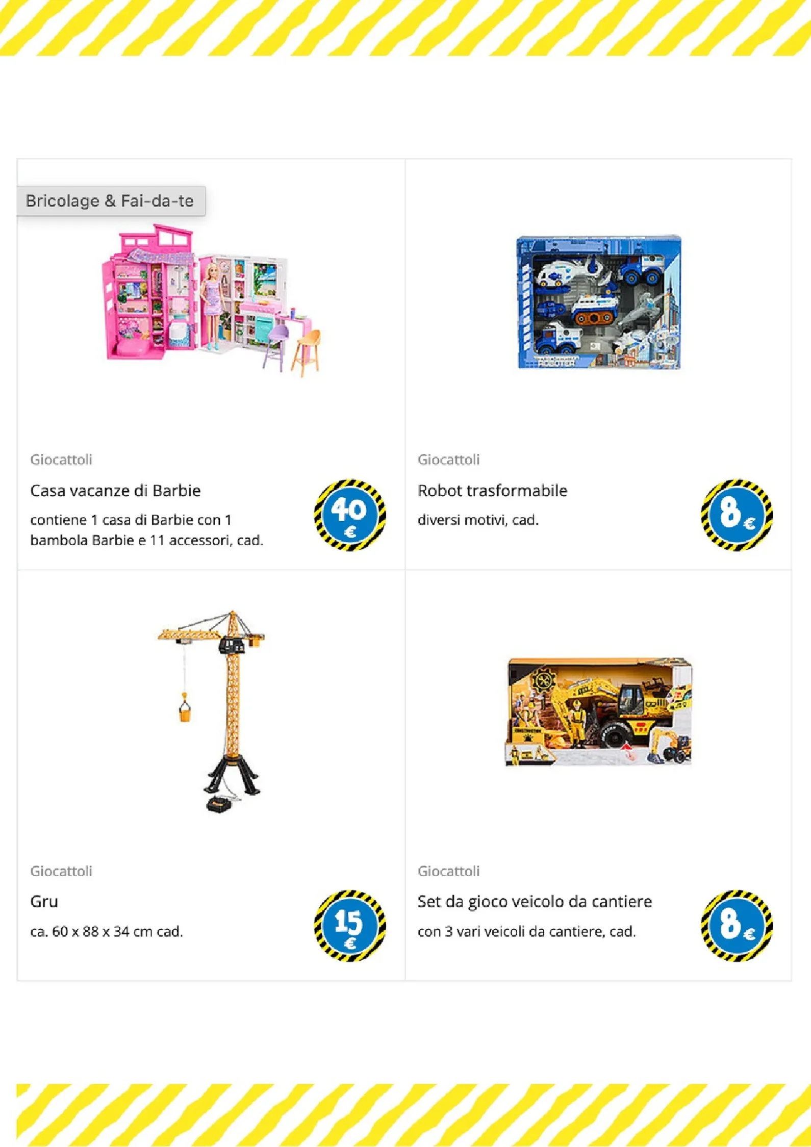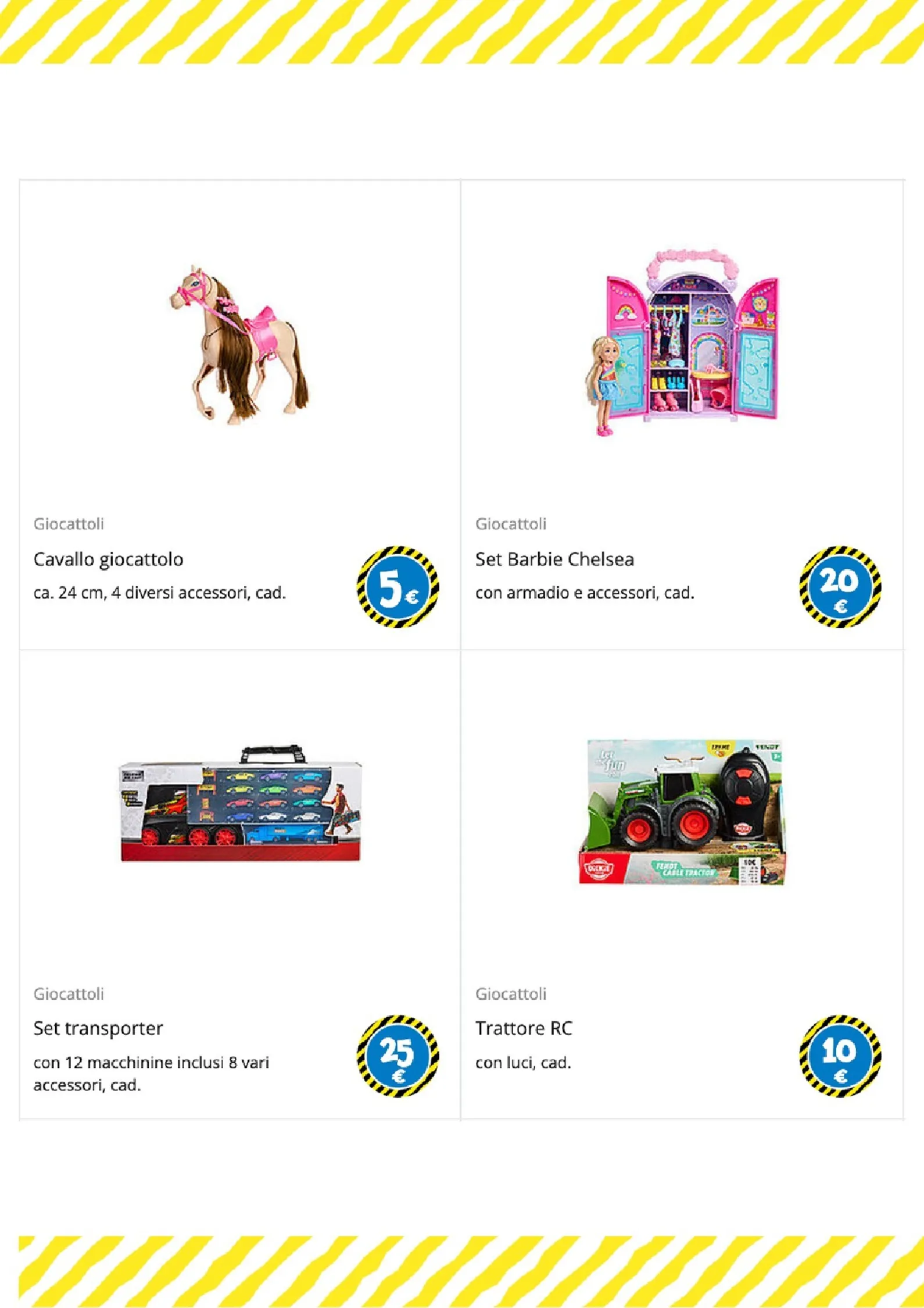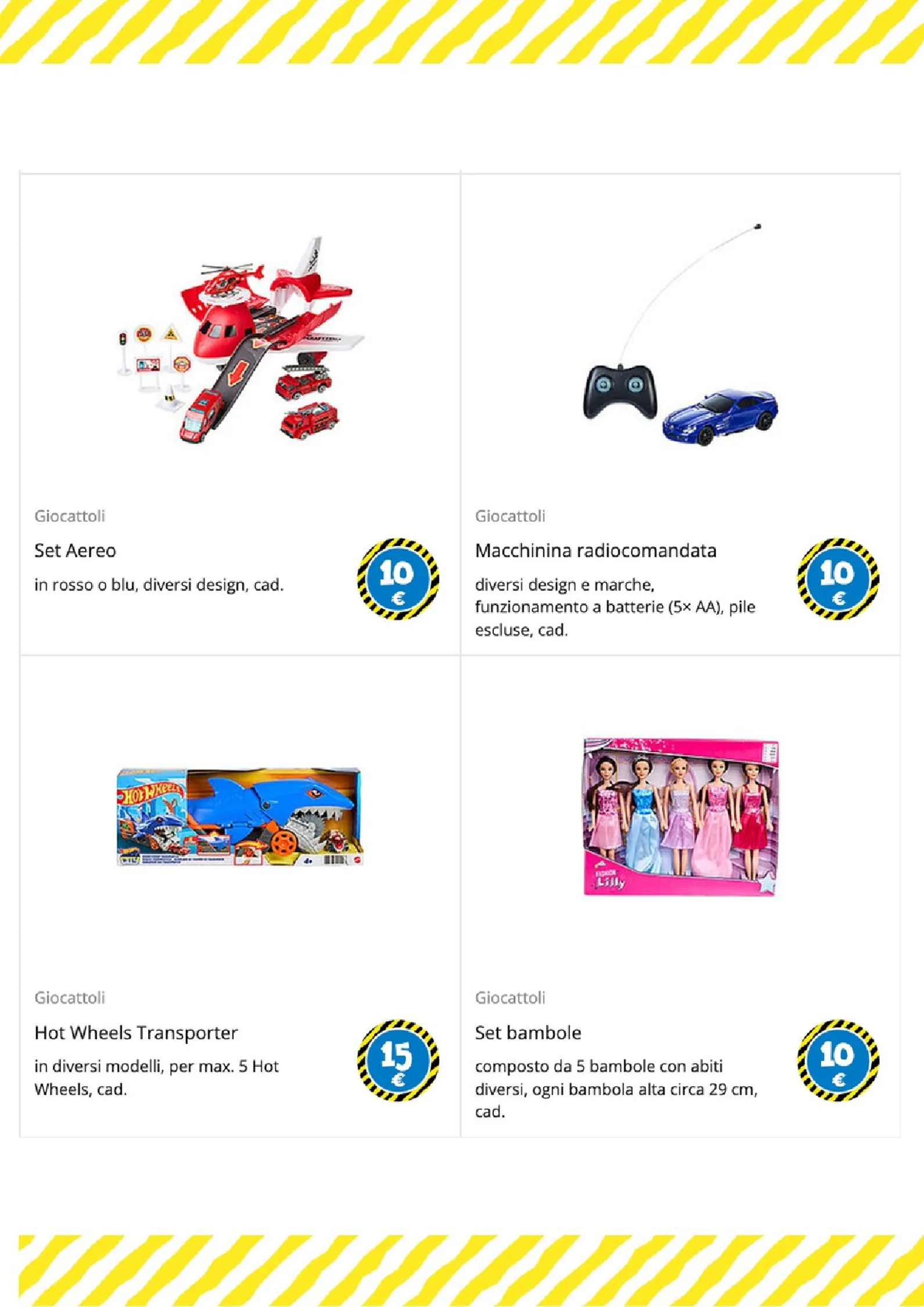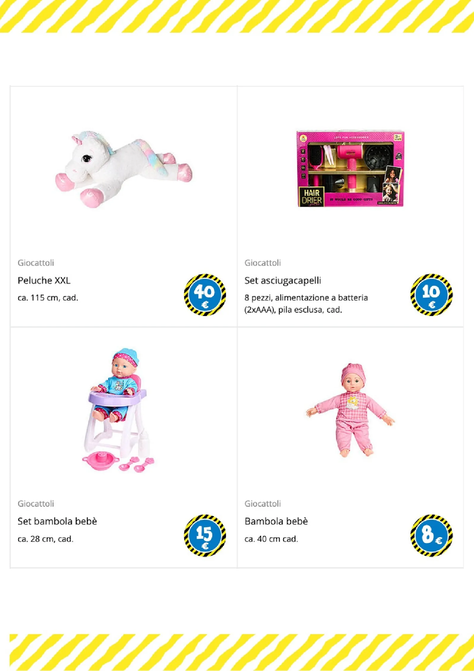 Per i più piccoli e gli amanti del gioco di ruolo, le opzioni sono numerose. Un morbido peluche a forma di coniglio è disponibile a 25€, mentre per le bambole ci sono il passeggino a 6€ e il biberon a 1€. La creatività è stimolata dai set di mattoncini a partire da 1€ e dal divertente set burger food truck, completo di accessori, a soli 5€.