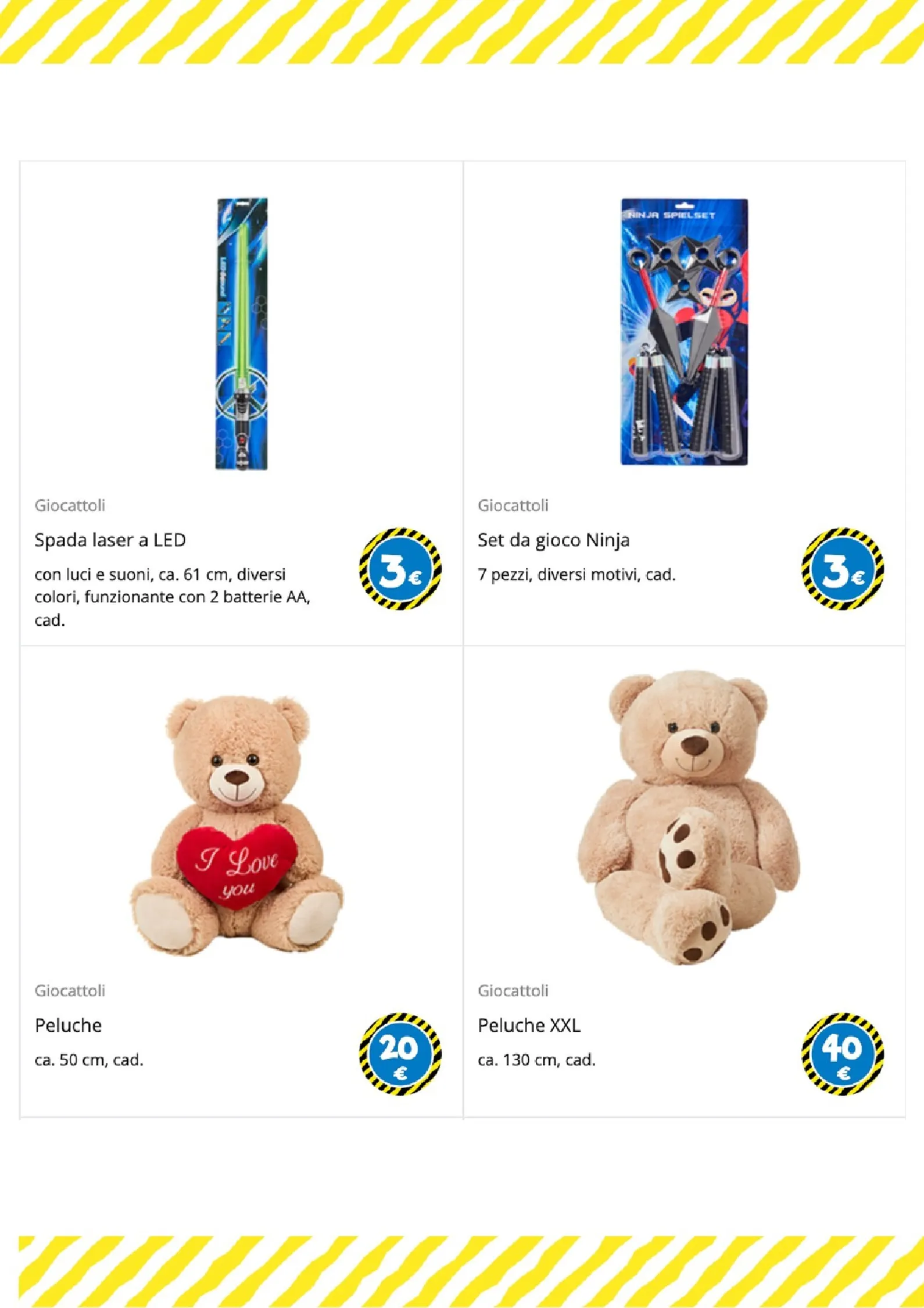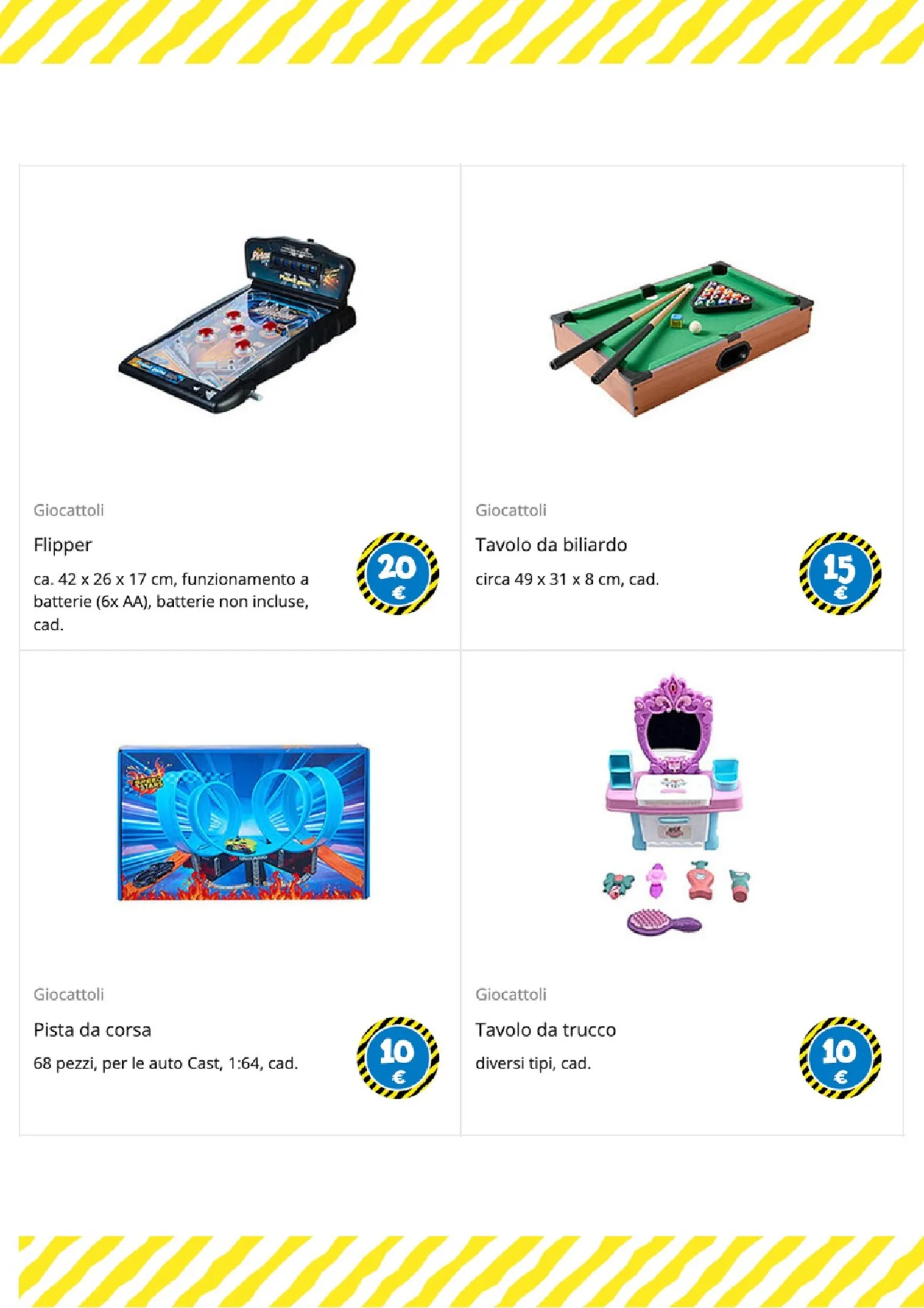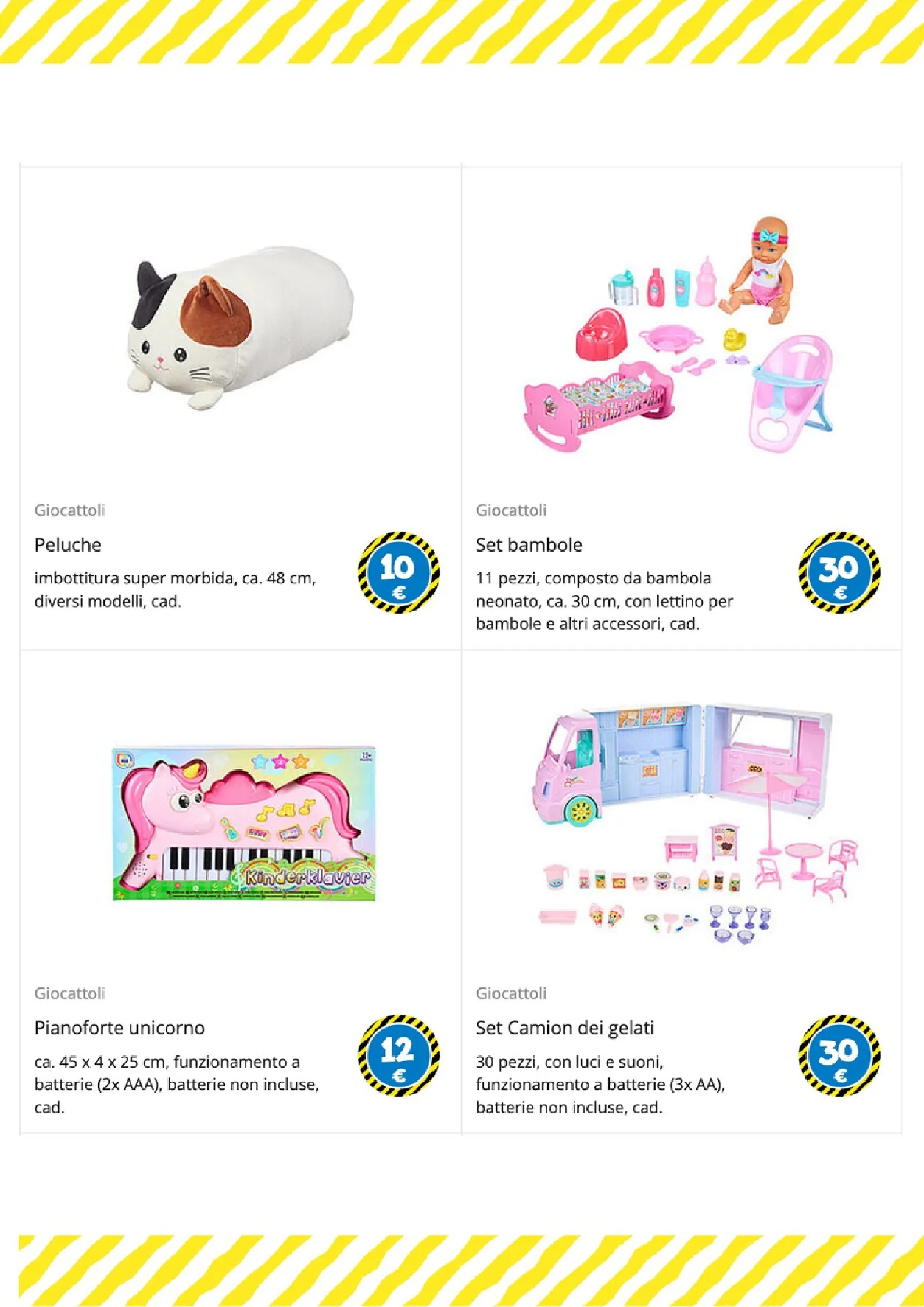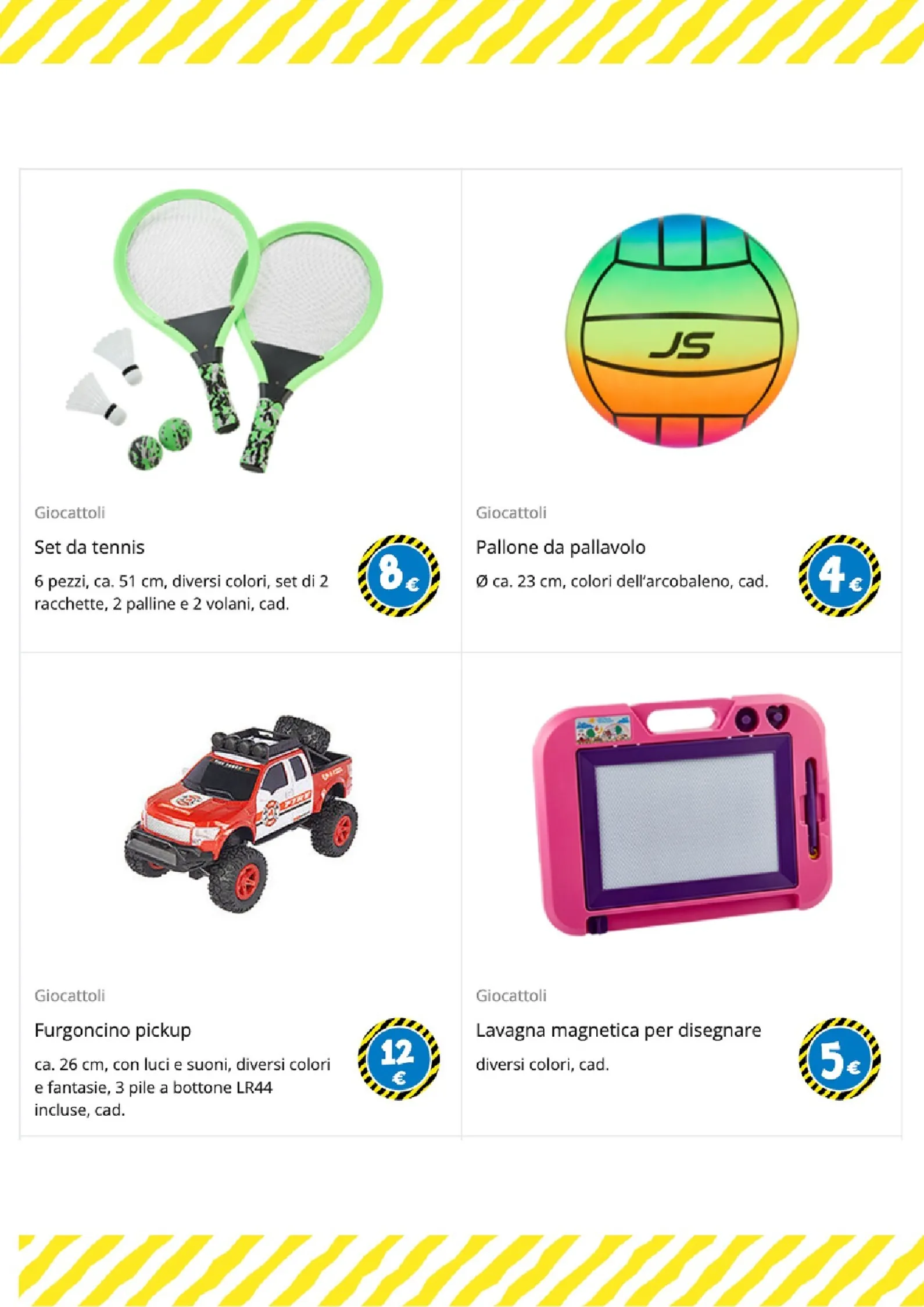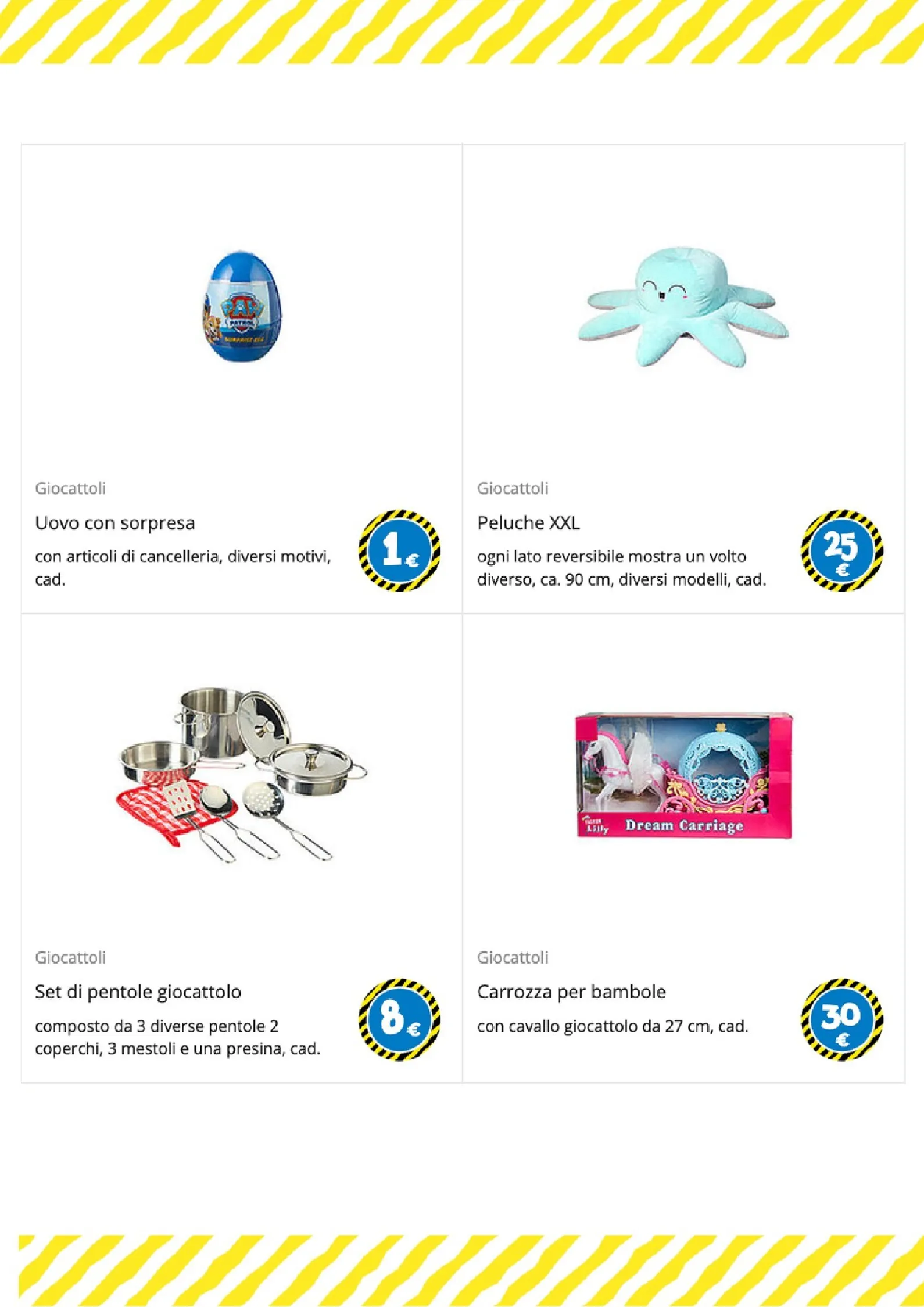 Per i più piccoli e gli amanti del gioco di ruolo, le opzioni sono numerose. Un morbido peluche a forma di coniglio è disponibile a 25€, mentre per le bambole ci sono il passeggino a 6€ e il biberon a 1€. La creatività è stimolata dai set di mattoncini a partire da 1€ e dal divertente set burger food truck, completo di accessori, a soli 5€.