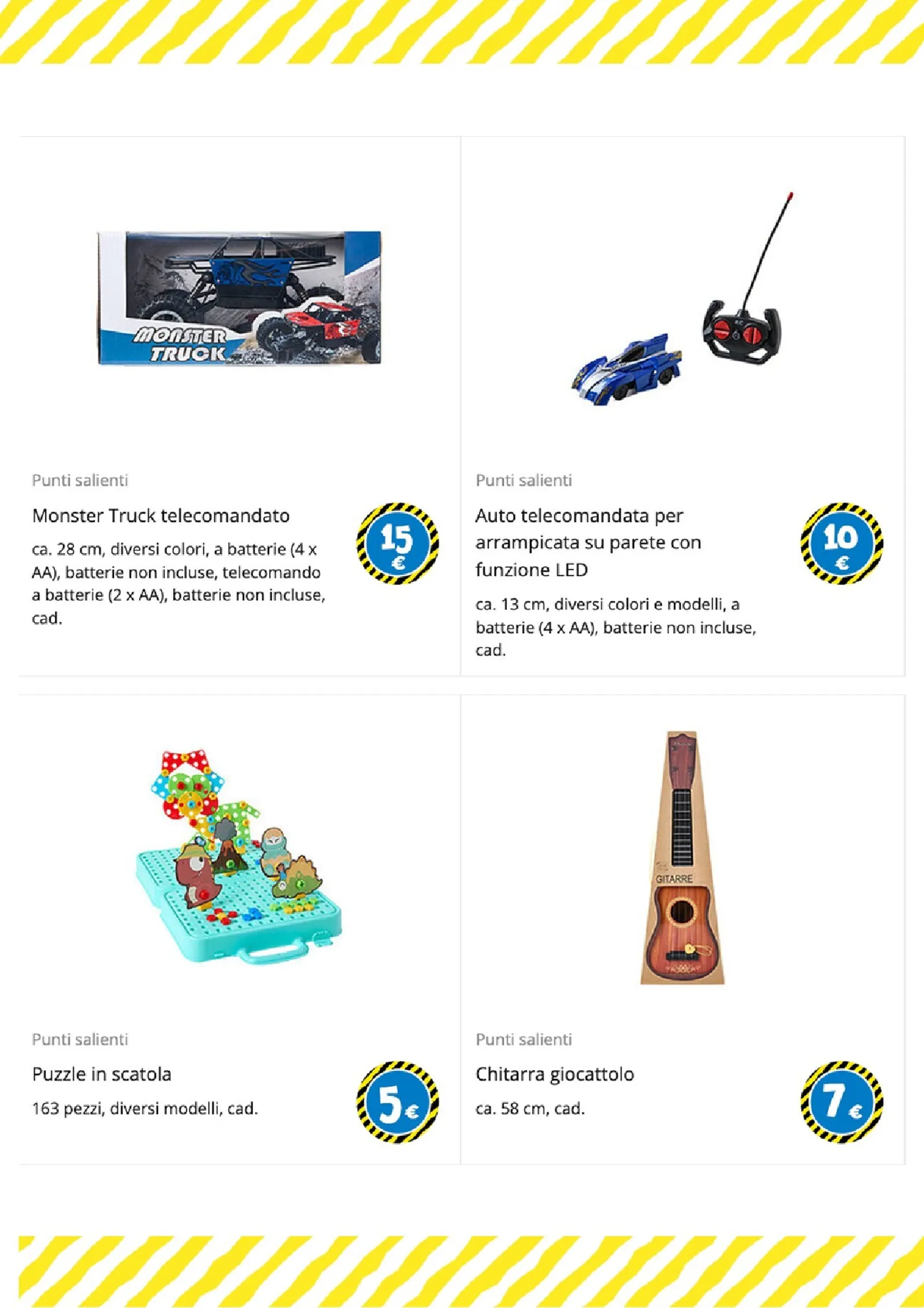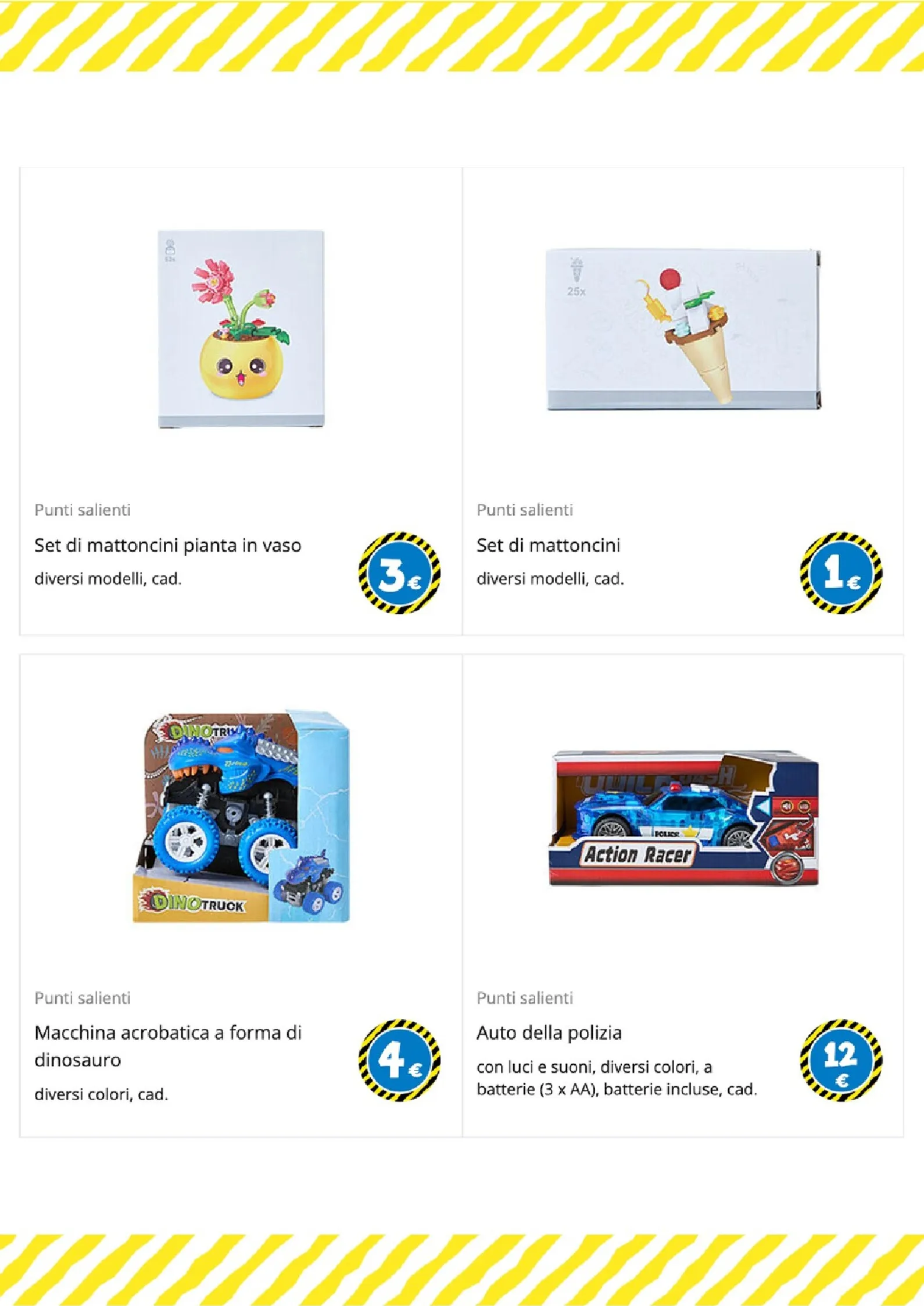 L’azione è protagonista con una vasta gamma di veicoli. Spicca l’auto della polizia con luci e suoni a 12€ e il potente Monster Truck telecomandato a 15€. Per un divertimento unico, l’auto telecomandata che si arrampica sui muri è proposta a 10€. Queste nuove offerte garantiscono ore di gioco, includendo anche una macchina acrobatica a forma di dinosauro a 4€.