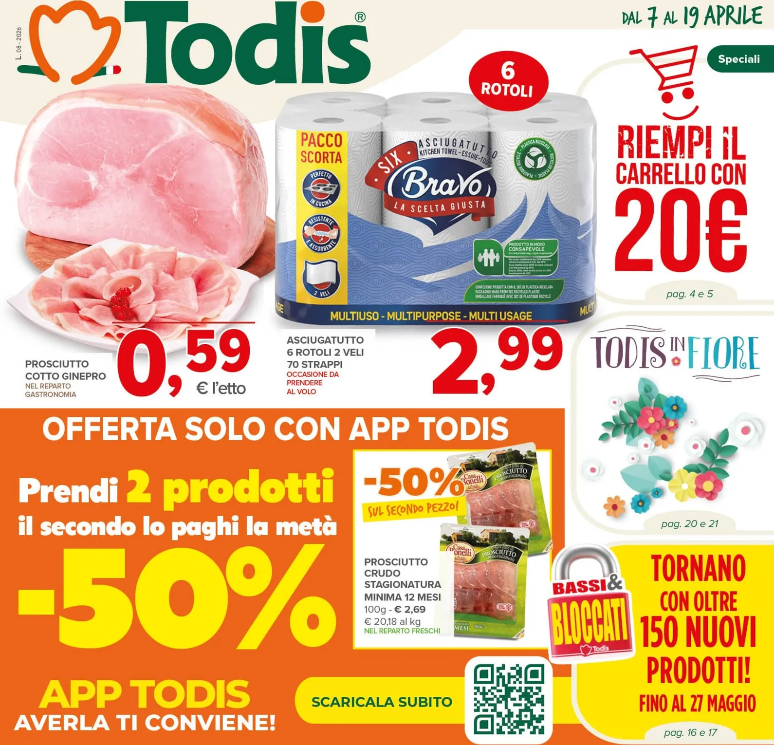 Il nuovo volantino Todis, valido dal 7 al 19 aprile, presenta offerte esclusive per chi usa l’app. La promozione principale sconta del 50% il secondo prodotto acquistato tra una ricca selezione, come il Prosciutto Crudo stagionato. Questo sistema di sconti alleggerisce la spesa. Approfittare delle Todis Volantino dal 07/04/2026 è il modo migliore per organizzare gli acquisti. Da non perdere il Prosciutto Cotto a 0,59€ l’etto e la carta assorbente Bravo a 2,99€.