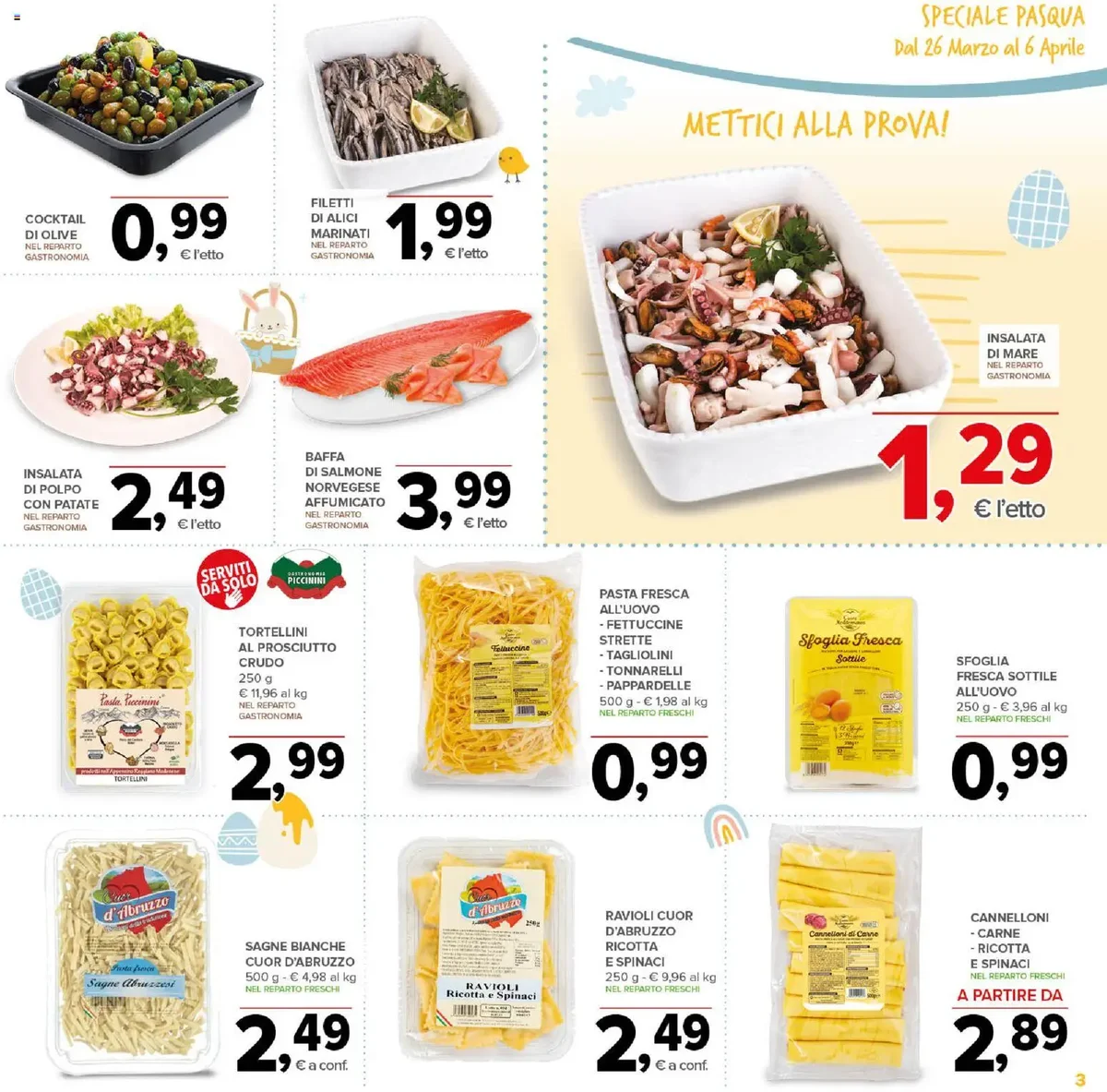 Tra le proposte più allettanti, spicca il PROSCIUTTO DI PARMA DOP a soli 2,49 € l'etto, perfetto per antipasti o un panino gourmet. Per gli amanti dei formaggi, il GRANA PADANO DOP SCELTO è disponibile a 0,95 € l'etto, mentre il PECORINO DI SIENA SEMISTAGIONATO a 1,79 € l'etto promette sapori autentici. Non mancano le specialità per la Pasqua, come la deliziosa PASTIERA NAPOLETANA a 6,90 €. Per la dispensa, troviamo l'essenziale OLIO EXTRA VERGINE DI OLIVA GREZZO 1L a 4,99 € e la PASSATA DI POMODORO a 0,69 €. E per la casa, non perdete la TOVAGLIA ANTIMACCHIA a 1,99 €. La sezione freschi include anche i TORTELLINI AL PROSCIUTTO CRUDO a 2,99 € e la PASTA FRESCA ALL'UOVO – FETTUCCINE a 0,99 €.