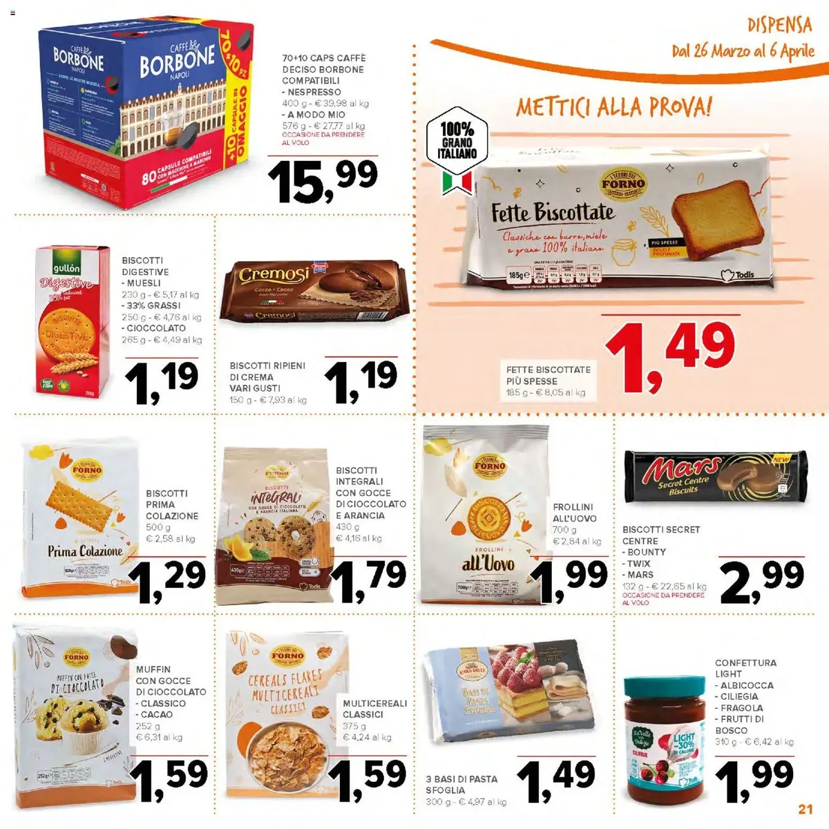 Per concludere in dolcezza il tuo pranzo pasquale, Todis propone la tradizionale Pastiera Napoletana a 6,90 € e la Torta Dolce al Formaggio a 5,49 €, due classici irrinunciabili. Queste e molte altre occasioni ti aspettano nel Volantino Todis dal 26.03.2026. Non perdere l'opportunità di riempire il carrello con prodotti di qualità a prezzi vantaggiosi.