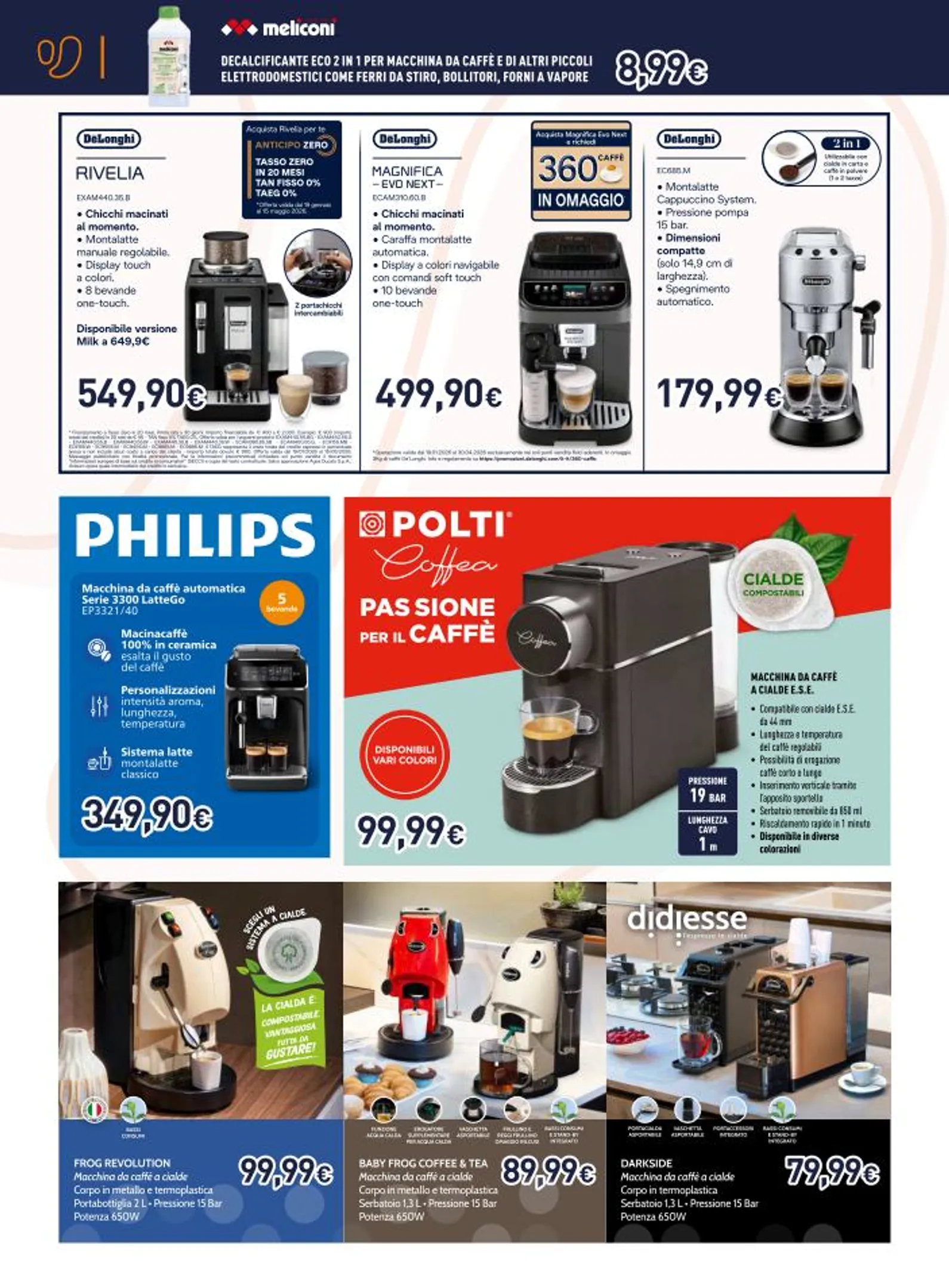 Gli amanti del caffè troveranno un vero paradiso di opzioni. De’Longhi presenta modelli automatici di alta gamma come la Rivela a 549,90€ e soluzioni più compatte come la EC685.M a 179,99€. Per chi preferisce la praticità delle cialde o delle capsule, la scelta è vastissima: dalle colorate Polti “Passione per il Caffè” a 99,99€ alle iconiche Frog Revolution e Didiesse Darkside. Non mancano le proposte Nespresso, con modelli come la Essenza Mini a 89,99€, e le macchine Nescafé Dolce Gusto Genio S a soli 64,99€. Ogni macchina è progettata per esaltare l’aroma e il gusto del caffè, trasformando la pausa quotidiana in un momento di puro piacere.