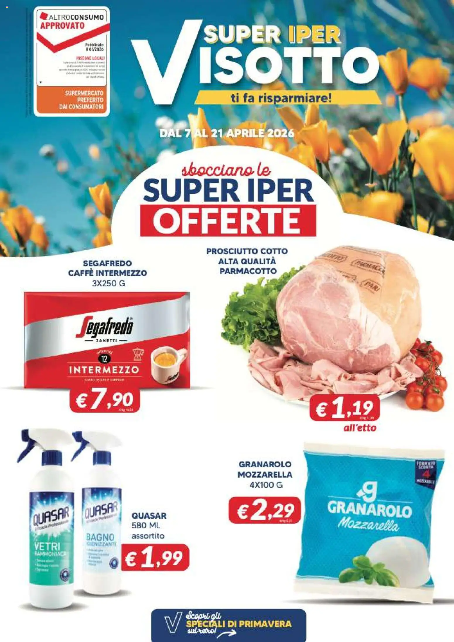 La primavera porta un’ondata di risparmio con il nuovo volantino Visotto, valido dal 7 al 21 aprile 2026. Le “Super Iper Offerte” permettono di riempire il carrello con qualità. Inizia con il Caffè Segafredo a 7,90€, la Mozzarella Granarolo a 2,29€, e il Prosciutto Cotto a 1,19€ l’etto. Esplorare queste nuovo offerte è il modo migliore per trovare il Visotto Volantino dal 07/04/2026 e rinnovare la dispensa con convenienza.