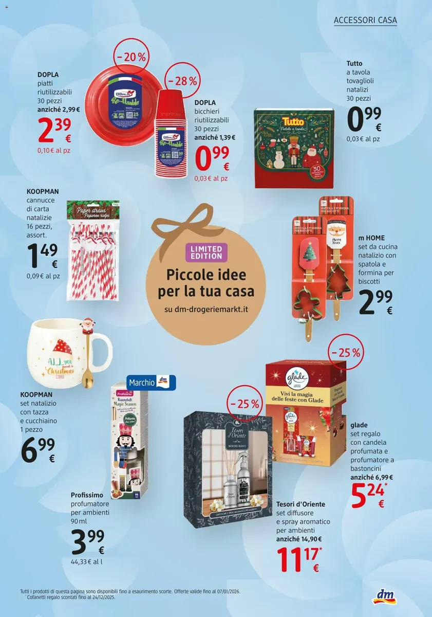 dm è conosciuto per la vasta gamma di marchi esclusivi come Balea, alverde, trend!t up e Denkmit, apprezzati per l’ottimo rapporto qualità-prezzo e per le formulazioni spesso naturali e delicate sulla pelle. Il nuovo volantino, valido dal 18.12.2025 Proprioio, include anche promozioni stagionali e offerte a tempo limitato disponibili solo per pochi giorni.