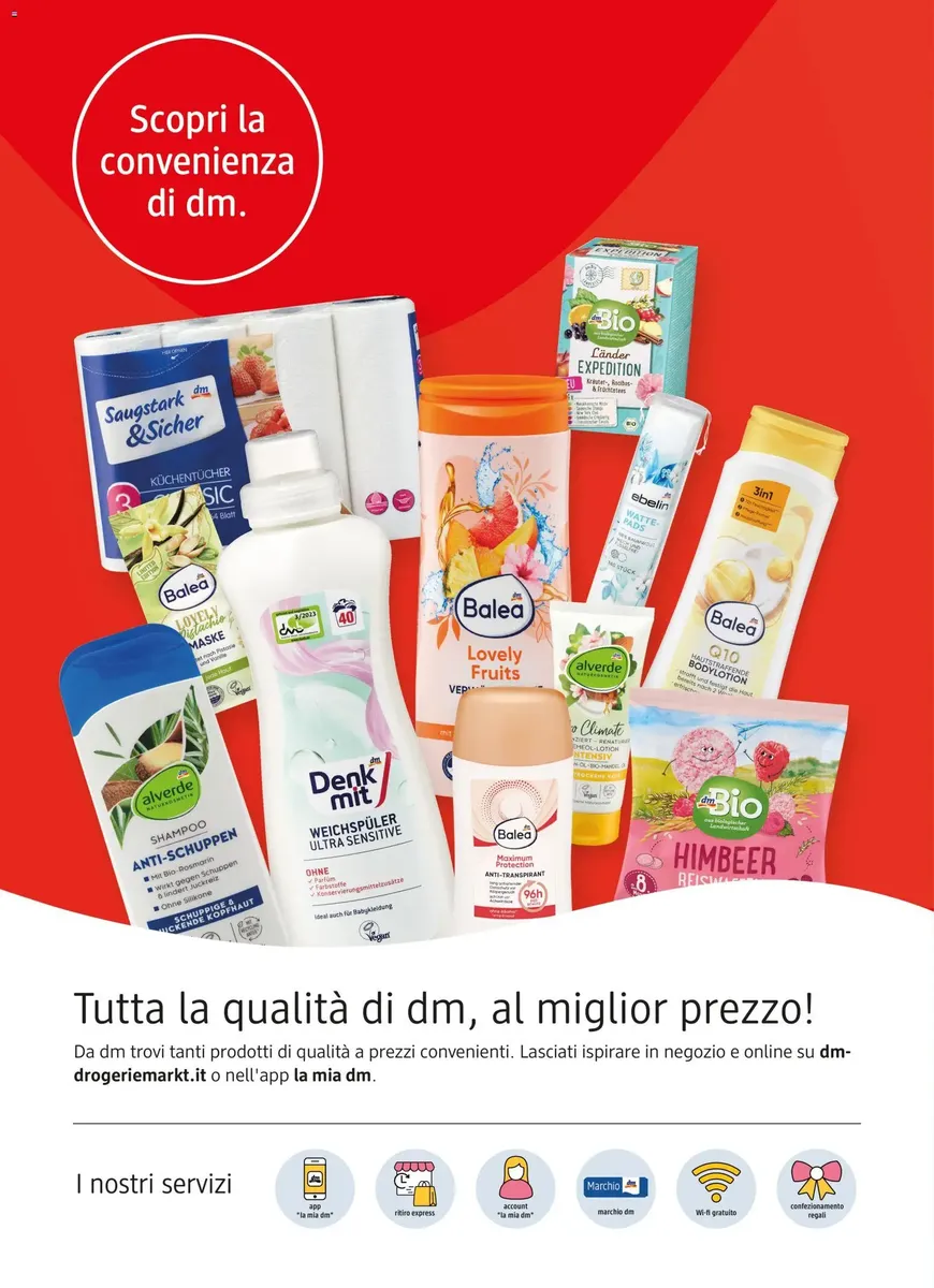 dm è conosciuto per la vasta gamma di marchi esclusivi come Balea, alverde, trend!t up e Denkmit, apprezzati per l’ottimo rapporto qualità-prezzo e per le formulazioni spesso naturali e delicate sulla pelle. Il nuovo volantino, valido dal 08.01.2026 Nuovo Volantino, include anche promozioni stagionali e offerte a tempo limitato disponibili solo per pochi giorni.